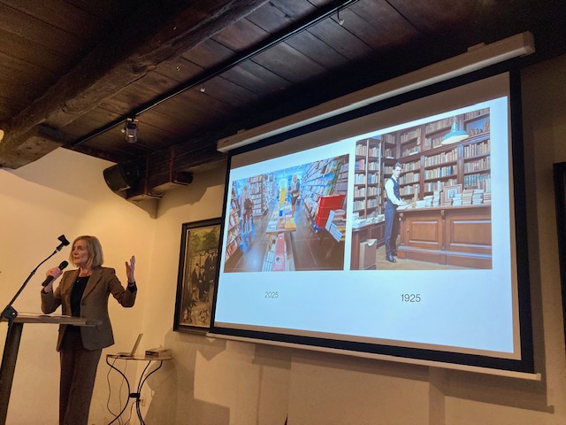 Na het hoofdgerecht gaf Anton Brand het woord aan Erica van Boven, ook bestuurslid van de Noordelijke Afdeling en voormalig hoogleraar Letterkunde aan de Open Universiteit en hoofddocent Moderne Nederlandse Letterkunde aan de Rijksuniversiteit Groningen. Zij publiceerde in 2015 Bestsellers in Nederland, een studie die zij op grond van de veranderingen op de boekenmarkt en in de leescultuur recent vernieuwde en omwerkte tot een volledig herziene uitgave, De bestsellermachine, een ongekend succesvol boek, waaraan de Volkskrant maar liefst vier hele pagina’s wijdde. Erica van Boven nam haar toehoorders mee langs tal van Nederlandse en internationale bestsellers uit de twintigste eeuw, maar vooral ook langs de ongekende veranderingen die zich in de afgelopen honderd jaar in het boekenvak en de boekhandel voltrokken.